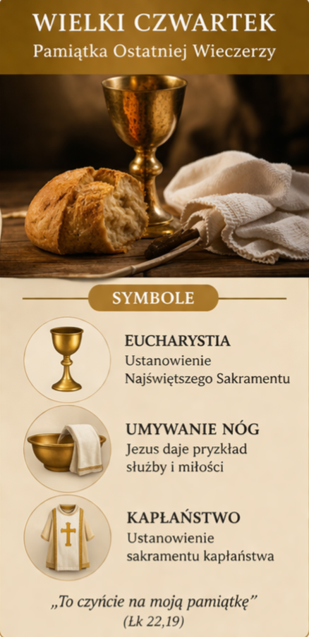Triduum rozpoczyna się wieczorną Mszą Wieczerzy Pańskiej. Wierni wspominają ustanowienie Eucharystii oraz kapłaństwa podczas Ostatniej Wieczerzy. Charakterystycznym znakiem tego dnia jest obrzęd umywania nóg, który przypomina o pokorze i służbie bliźniemu. Po liturgii Najświętszy Sakrament przenoszony jest do tzw. „ciemnicy”, gdzie wierni trwają na adoracji.