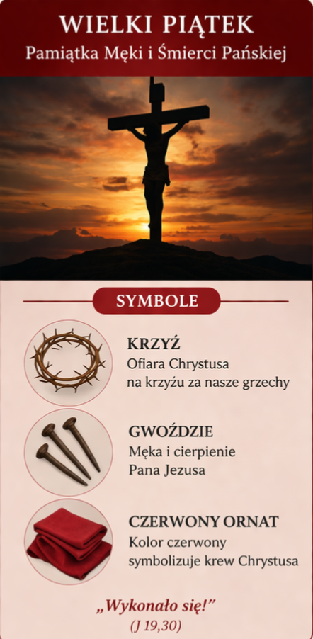 To jedyny dzień w roku, kiedy nie sprawuje się Mszy Świętej. Kościół skupia się na liturgii Męki Pańskiej, podczas której czytany jest opis ukrzyżowania Jezusa. Centralnym momentem jest adoracja krzyża – symbolu zbawienia. Wierni zachowują post ścisły i powstrzymują się od spożywania mięsa, podkreślając powagę tego dnia.